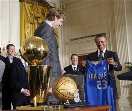 President Barack Obama is presented with a Dallas Mavericks team basketball jersey from Dirk Nowitzki as he honored the 2011 NBA basketball champions Dallas Mavericks, Monday, Jan., 9, 2012, in the East Room of the White House in Washington. (AP Photo/Pablo Martinez Monsivais)