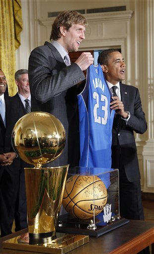 President Barack Obama is presented with a Dallas Maverick team basketball jersey from Dirk Nowitzki, as he honored the 2011 NBA basketball champions Dallas Mavericks, Monday, Jan., 9, 2012, in the East Room of the White House in Washington. (AP Photo/Pablo Martinez Monsivais)